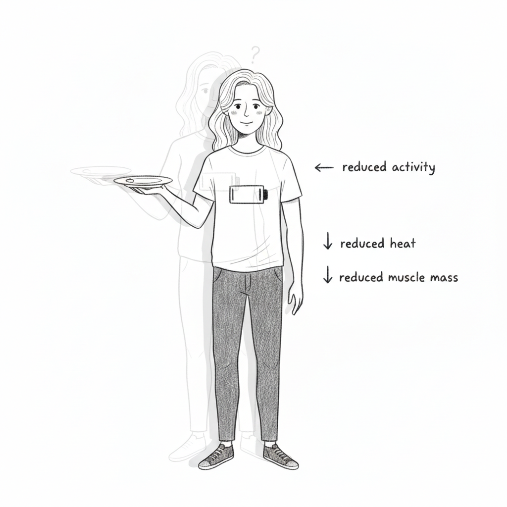 zu wenig Energie für Muskulatur, Wärmeproduktion, Hormone, Alltagsbewegung und Regeneration. Und genau das reduziert den Verbrauch und macht den Fettabbau nahezu unmöglich.